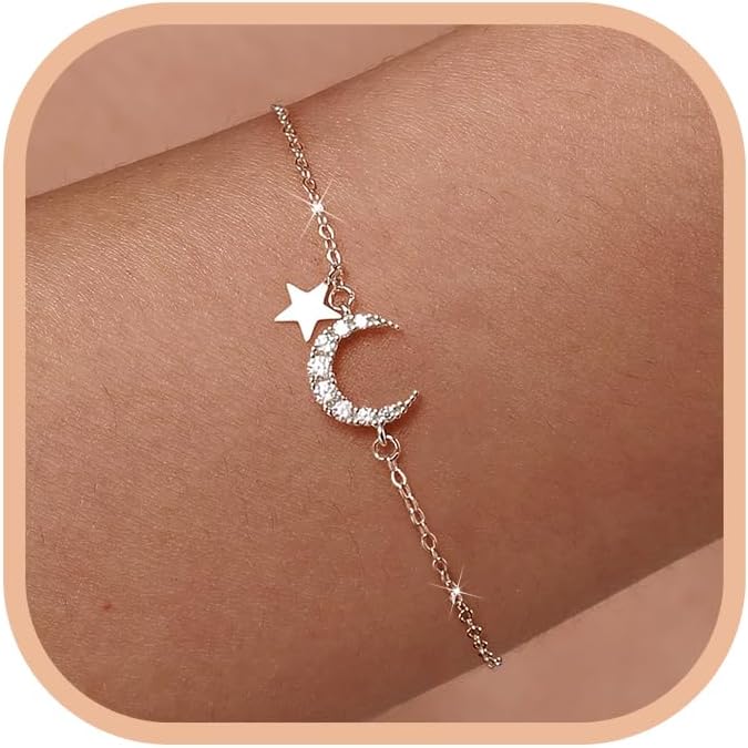925 Sterling Silver Star Moon Bracelets for Women Dainty 14K Gold Plated CZ Crescent Link Bracelet Lucky Friendship Charm Chain Bangle Jewelry Birthday Gifts for Mom Daughter Friends 925 Sterling Silver Star and Moon, Cute and Classic design, fashionable and minimalist. Trendy and Dainty Love Heart Adjustable Finger Ring that you can Your Story and Your Interesting Soul Special Gifts for Someone You Love: It would make an ideal gift for any occasion, or a lovely addition to your own collection. Perfect for Party, Dating and Special Occasions. Birthday, Christmas Day, Mother's Day, Easter, Thanksgiving Day, Grauation, Back to School, Wedding Anniversary, Valentine's Day, Party Jewelry Gifts for Mom Wife Daughter Sister Friends Girlfriend Grandma Granddaughter Care Tips for your jewelry: Before showering and sleeping, take off the jewelry and keep it away No solvents or chemicals like perfume, chemicals Wipe with soft cloth daily Use only a soft brush, never sharp or hard objects, to remove dirt or particles Avoid hitting your moon bracelet against any hard object