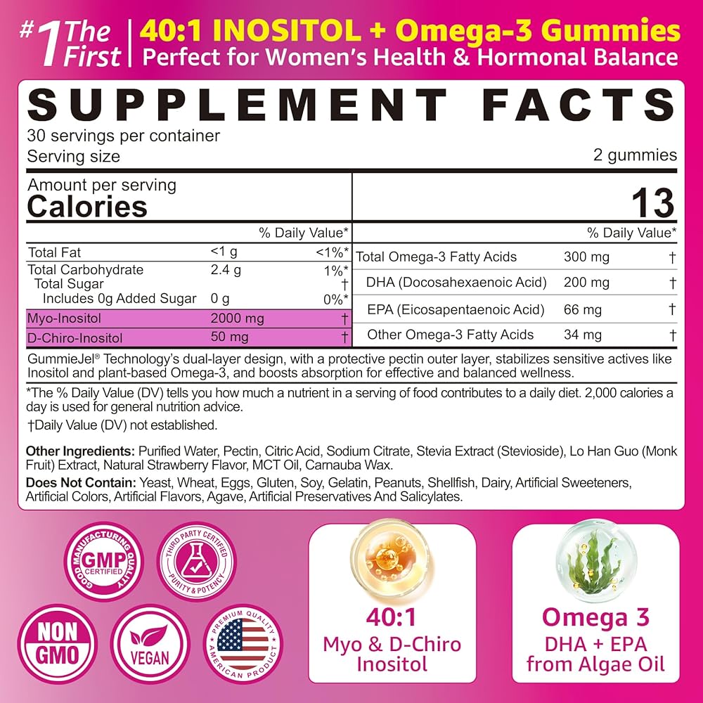 【Precision Inositol + Omega-3 Formula + GummieJel Technology】 Unlike single-ingredient or overly complex blends, our Inositol + Omega-3 gummies use advanced GummieJel technology that locks the clinically balanced 40:1 Myo-Inositol to D-Chiro-Inositol and 3:1 DHA to EPA Omega-3 ratios together into the gummy's core. This Inositol + Omega-3 supplement ensures better protection, easier absorption, and targeted support — simple, focused, and designed for women's real hormonal and metabolic needs.