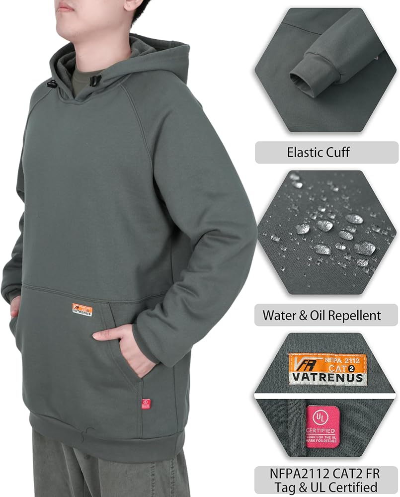 This fire resistant hoodie is designed to meet or exceed CAT2/HRC2 standards arc rating Atpv 23 Calories/cm2, meets the requirements of the NFPA2112 standard on flame resistant garments for the protection of industrial personnel against flash fire, 2012 edition.NFPA70E, ASTM F1506 and CAT II Certified by UL(check more on tag).
