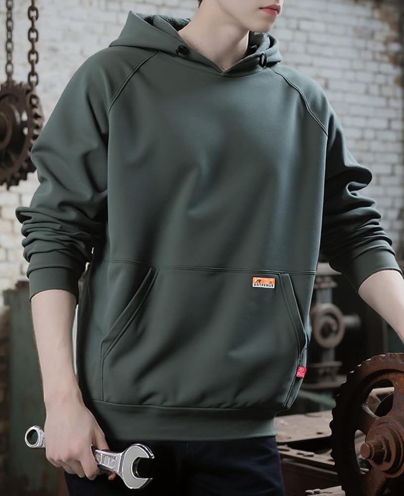 Made by 12oz heavyweight flame resistant cotton fleece fabric,water repellent and oil resistant finish.FR CAT2 tag and UL lable on the pocket.Rib knit cuffs and hem