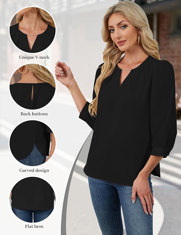 Chic Sleeves: 3/4 length sleeve womens tops with puff sleeve detail,and Button-cuffed closure makes the arms more slender, The ightweight chiffon long sleeves makes the arms seem to be breathing in fresh air, feeling relaxed comfortable and breathable