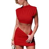 Womens Casual Summer Cap Sleeve Mock Neck Crop Tops Slim Fit Ruched Mini Skirts Two-Piece Outfits Set 2025 Trendy