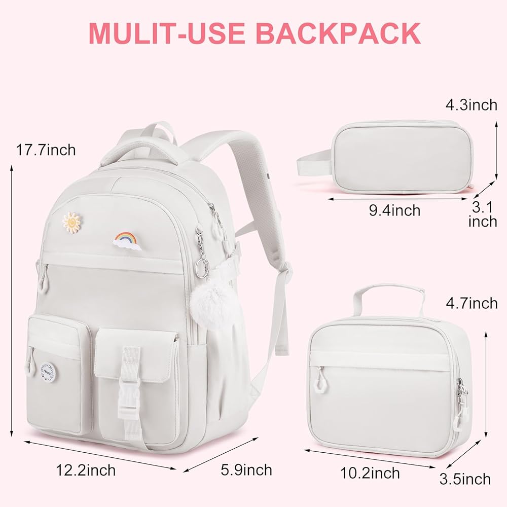 Perfect School Backpack Set for Girls: Designed for students, this water-resistant backpack + lunch bag + pencil pouch set features sturdy nylon & zippers. The insulated lunch box keeps food fresh, while the 8.5" pen bag doubles as a cute purse. Ideal for teens!