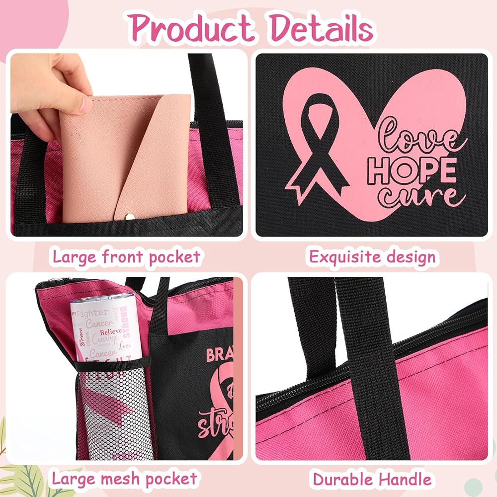 Spacious and Convenient: the breast cancer awareness tote bag offers ample space for laptops, books, and groceries, featuring pockets for organization; The compact cosmetic bag is suitable for makeup essentials; This set is ideal for honoring survivors and spreading breast cancer awareness