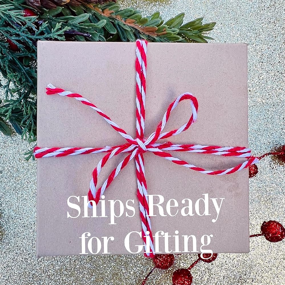 Ornament is boxed in a kraft gift box and tied with bakers twine, ready for gifting