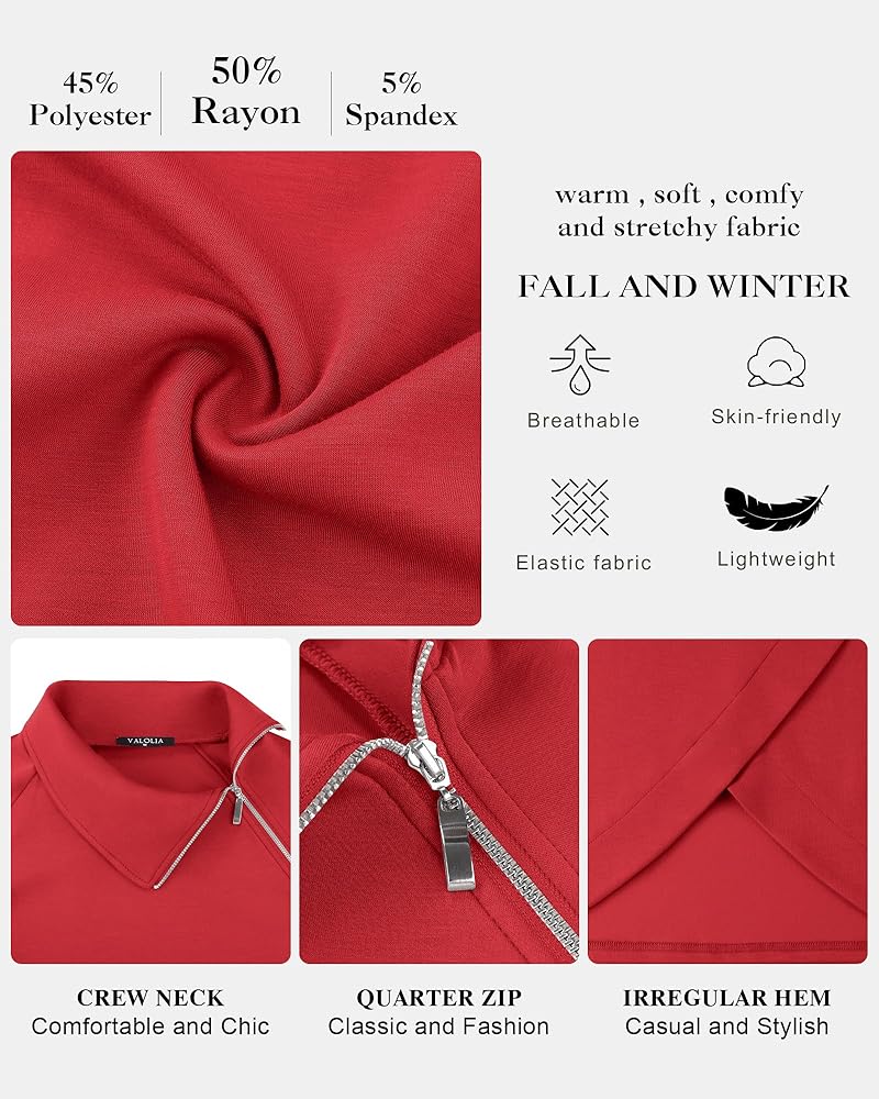 Soft Fabric: 45% Polyester, 50% Rayon, 5%Spandex. Lightweight, Stretchy, Cozy and Comfortable to wear. This women half zip pullover suited for a fall day or for wearing as a layering piece.