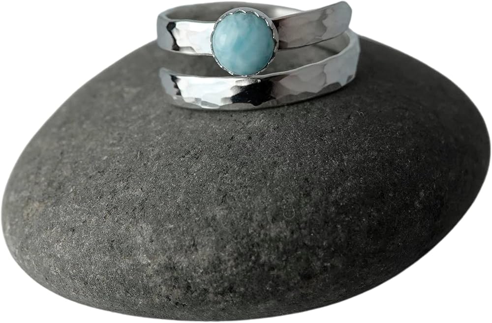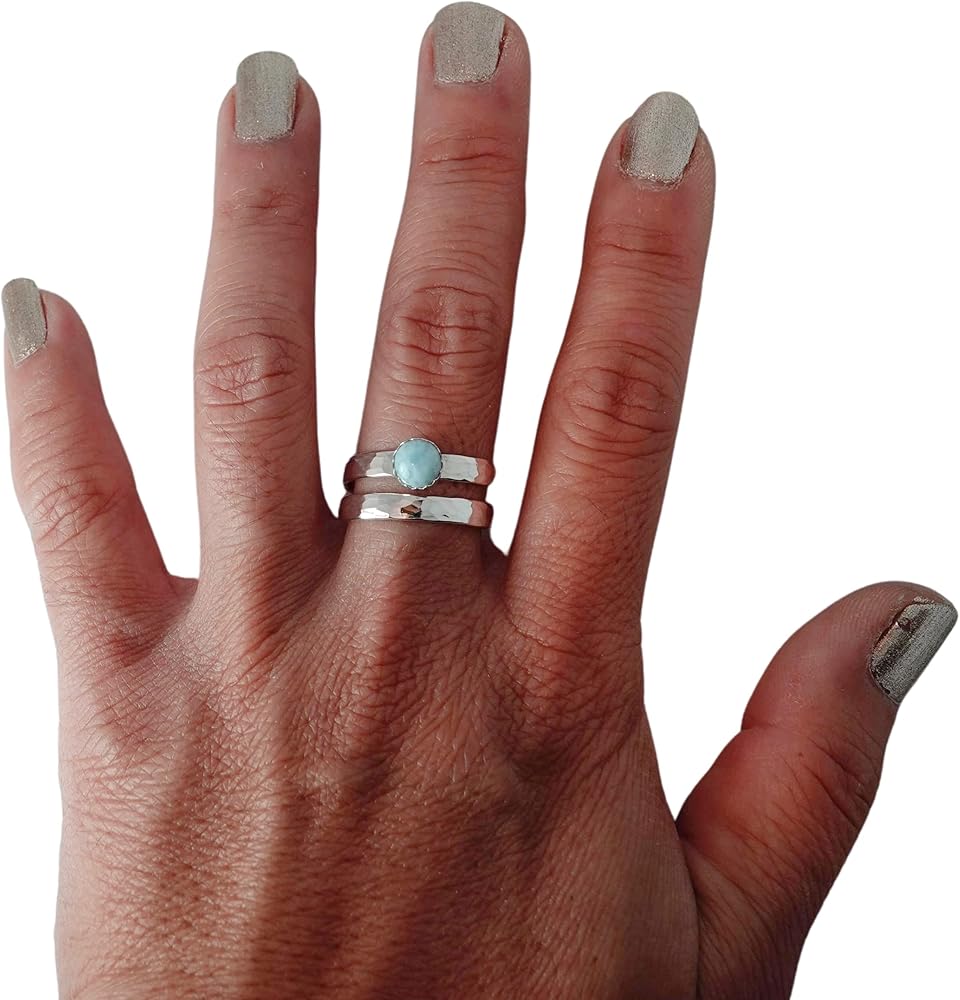 This hammered Silver ring featured a gorgeous genuine Larimar cabochon. The cabochon gemstone measures 6mm in diameter and the ring is 1/8" inch, it is sturdy, but not chunky. The stone is small enough to not catch on stuff. The ring is made with solid Sterling Silver. It fits a 6, 7, 8, 9, and 10 ring size and is adjustable. The silver is thick and high quality and very comfortable to wear. Everything about this ring is made carefully by hand. The ends are smooth and it is simple and very comfortable and perfect for everyday wear. This will be your new go-to ring! It will come in a little jewelry box.
