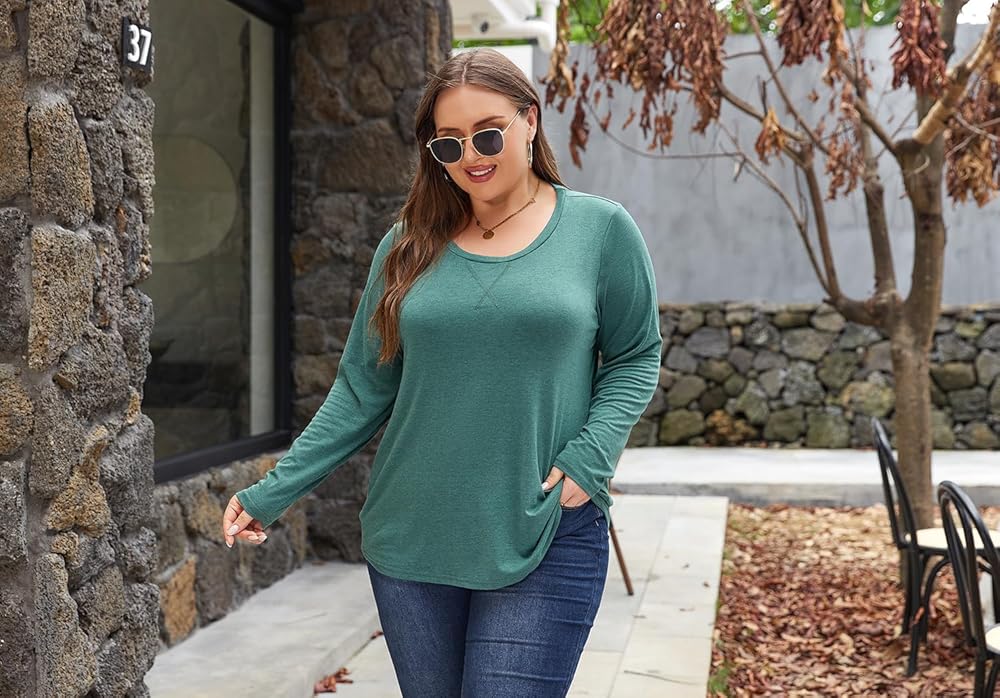 Long Sleeve Plus Size Tunic Womens Tops - Classic U Neck plus size tops for women, long sleeve women's plus tops with long enough flowy hem to hide belly and hips, stretchy plus size solid shirts for women perfect for oversized ladies or as maternity clothes.