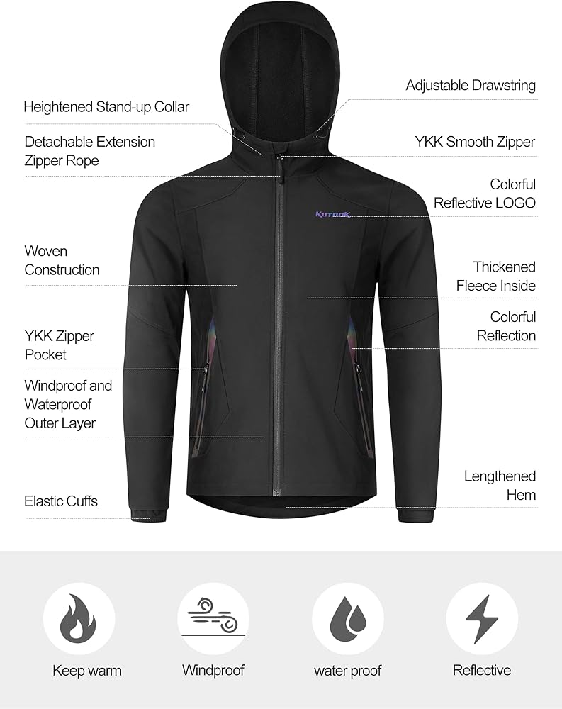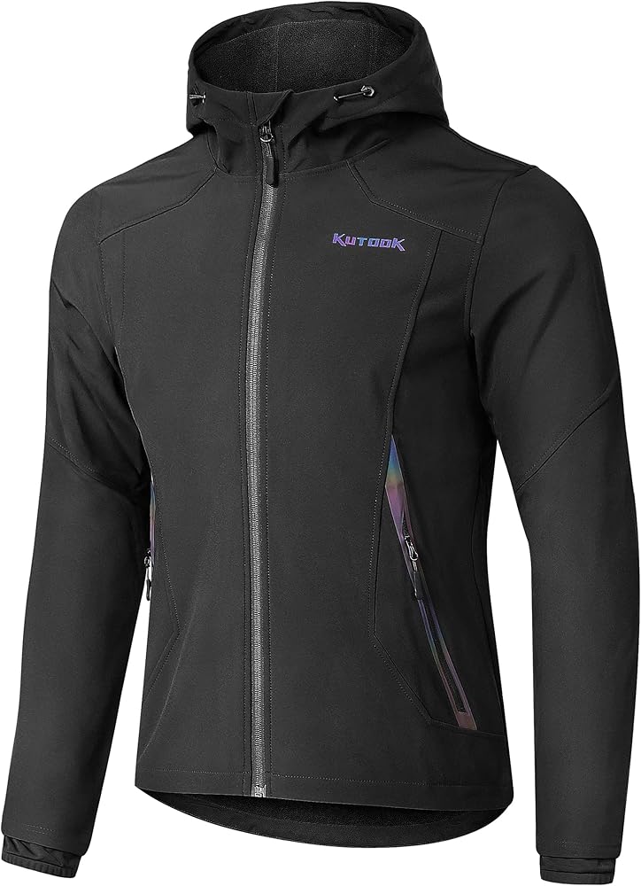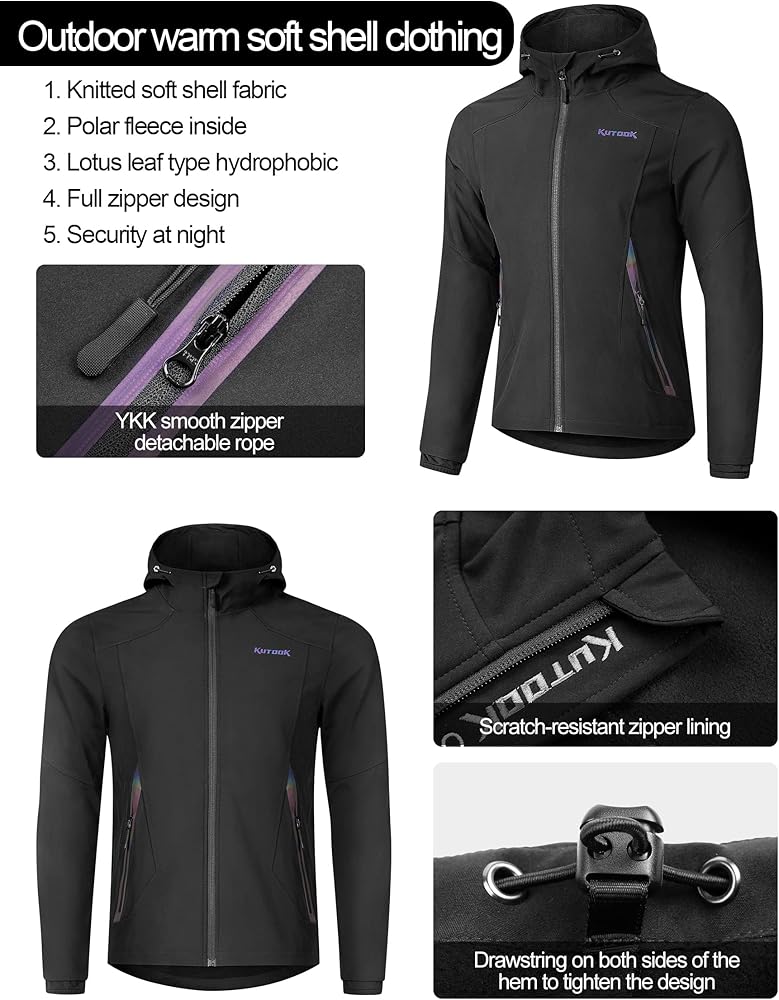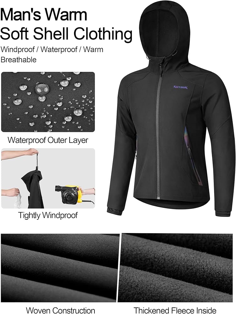 KUTOOK Men's Hooded Softshell Cycling Jacket Thermal Fleece Windbreaker Windproof Warm Jacket Outdoor Hiking