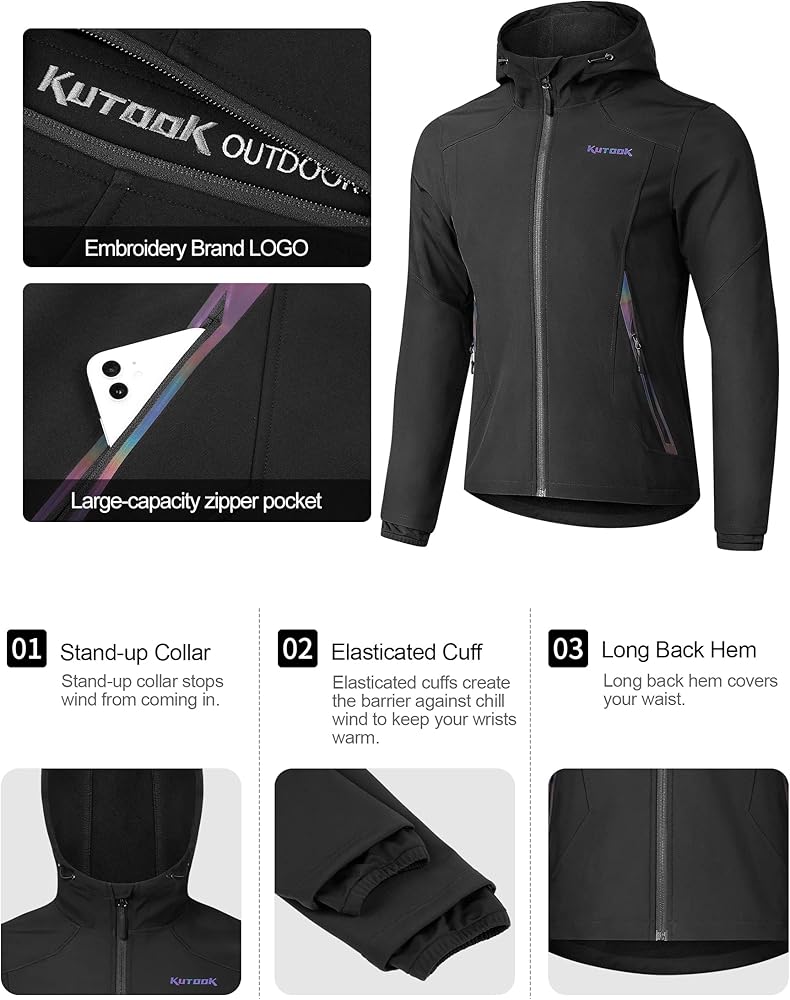 KUTOOK Women's Softshell Jacket with Hood, Lightweight Thermal Fleece Lined Windproof Water Repellent Coat for Hiking Running