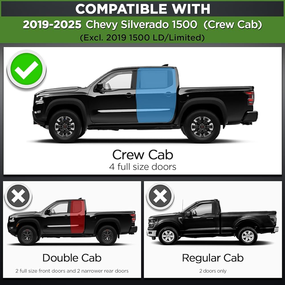 Fitment: Compatible with 2019-2025 Chevy Silverado 1500 Crew Cab (4 Full Size Doors).