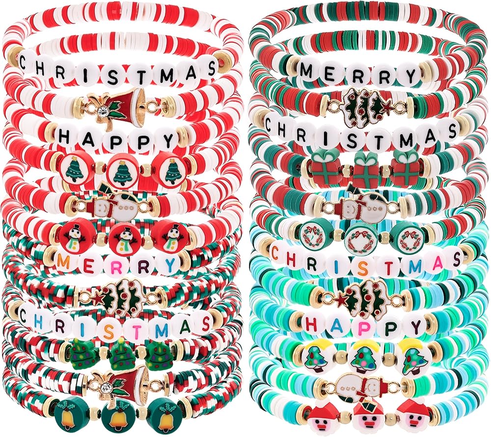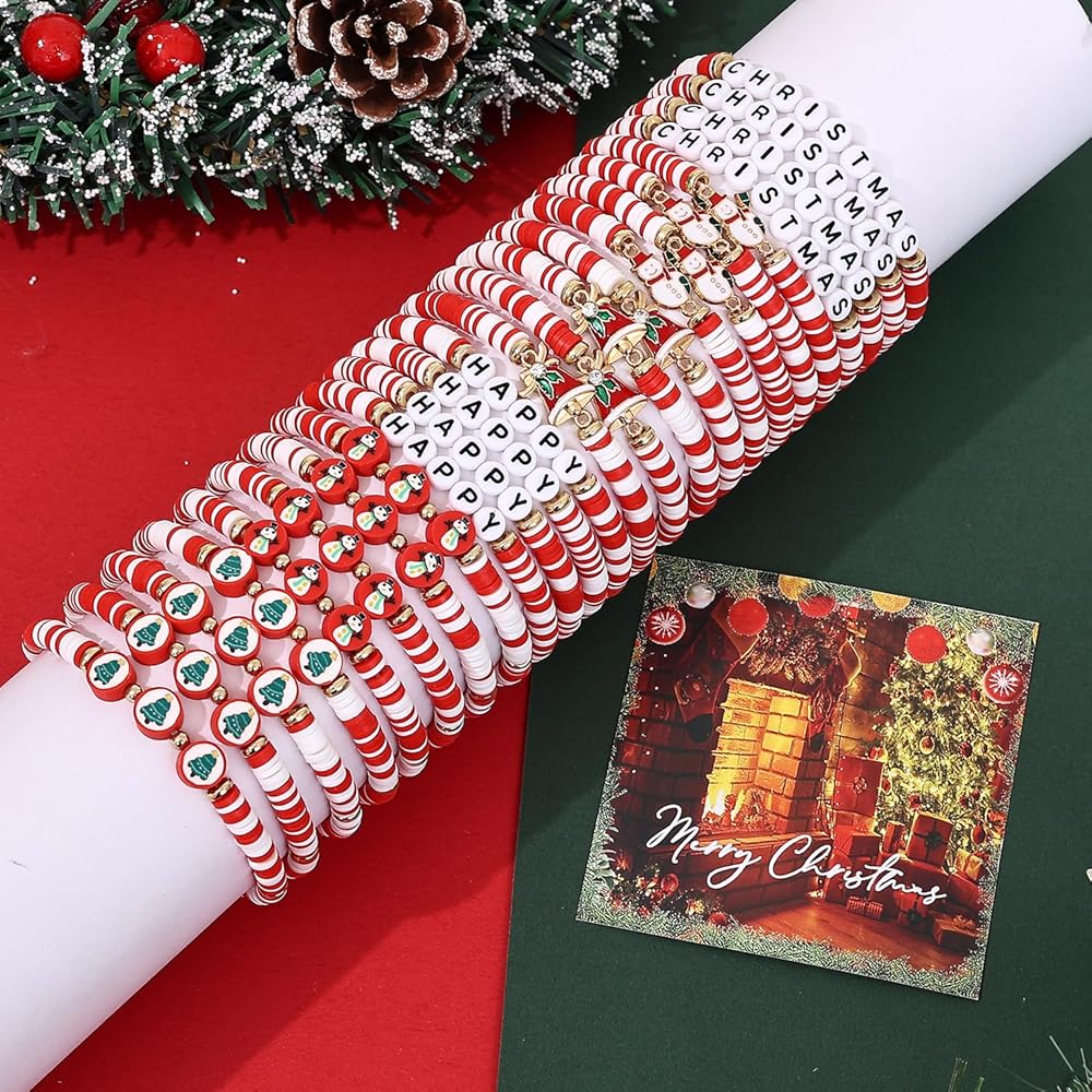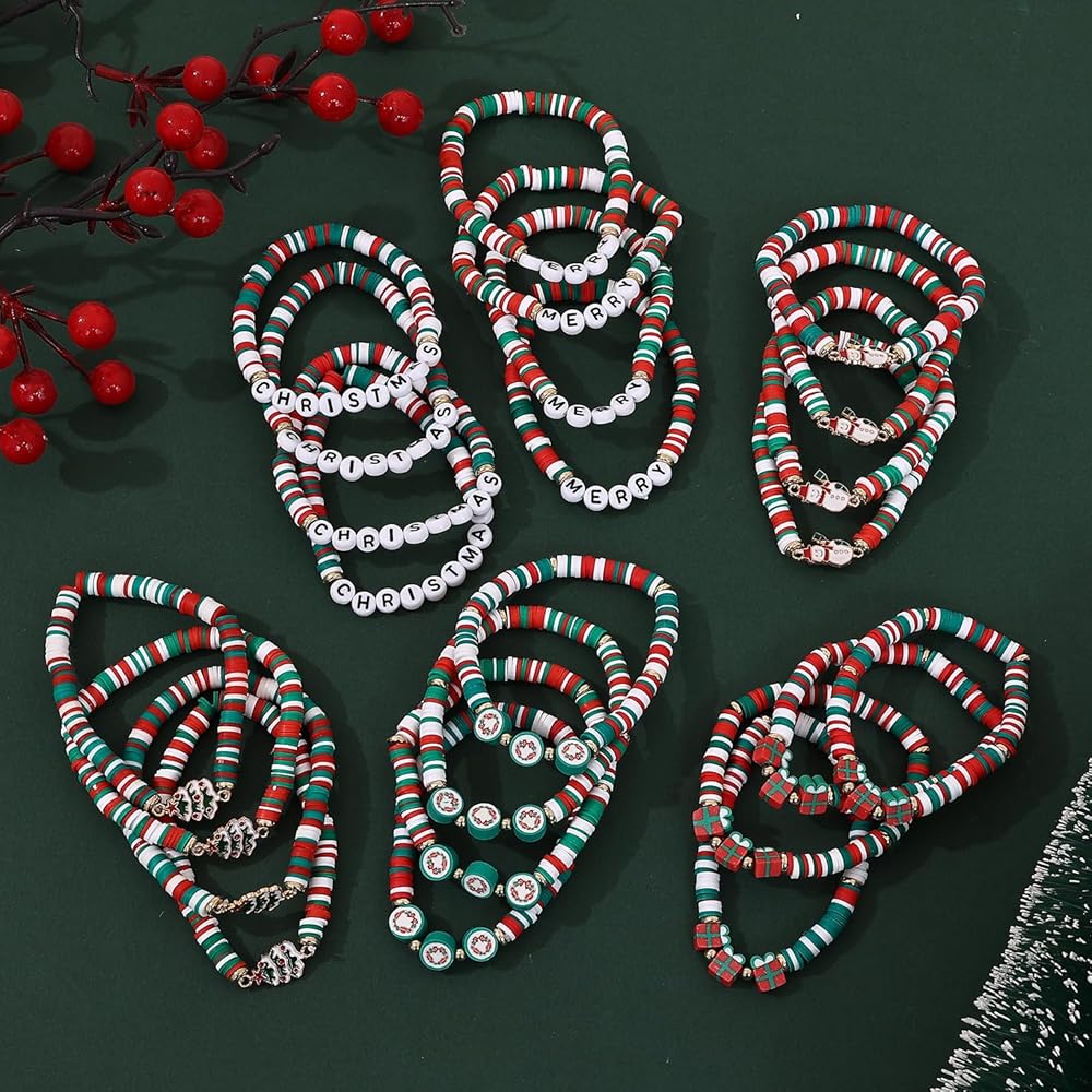 Taouzi Christmas Bracelets for Women Bulk Christmas Jewelry Set Handmade Clay Beads Stretch Surfer Heishi Bracelets Xmas Friendship Jewelry Xmas Gifts for Women