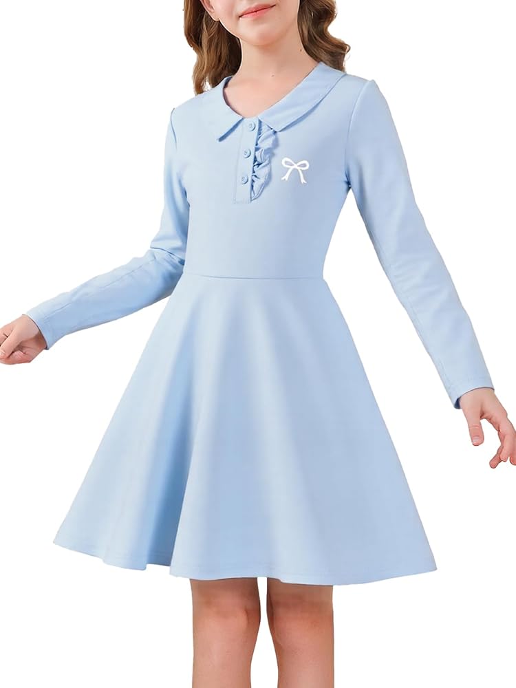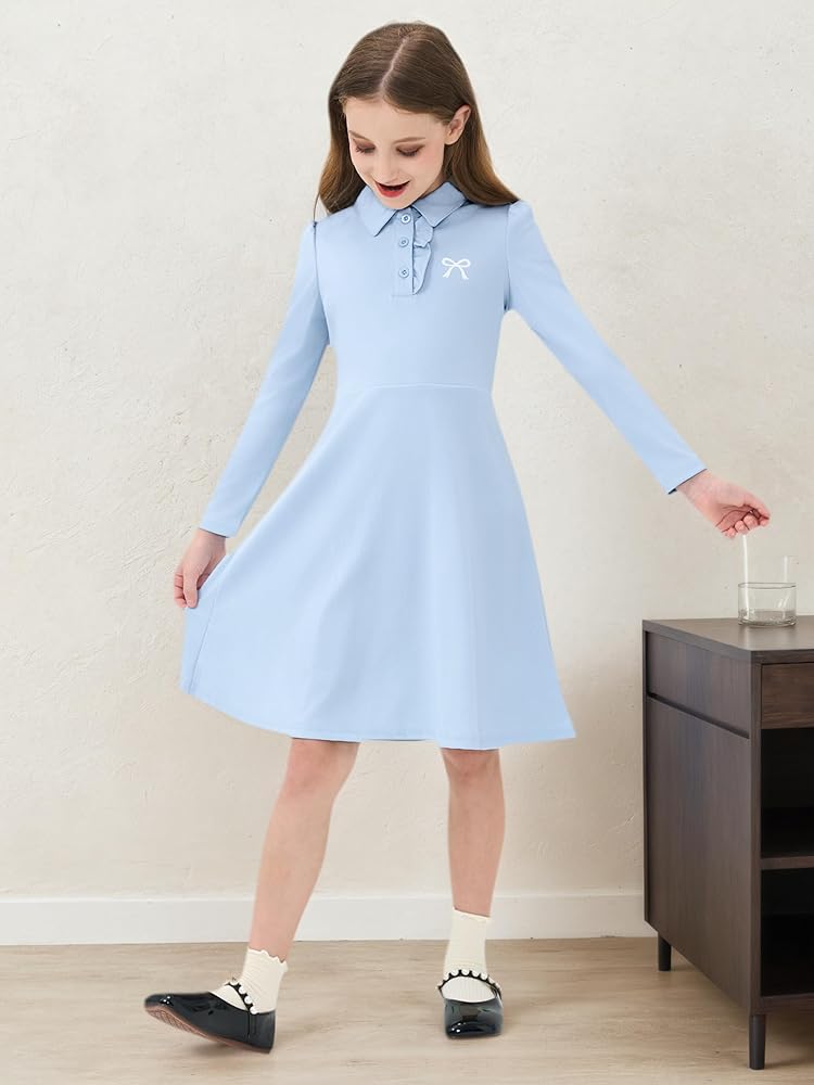 🎀 Features: High-waisted a-line cut with a polo collar featuring three buttons and with ruffle deatails along the side, swing loose skirt, simple but lovely simplified drawing bow print, dressing little girls more sweet!