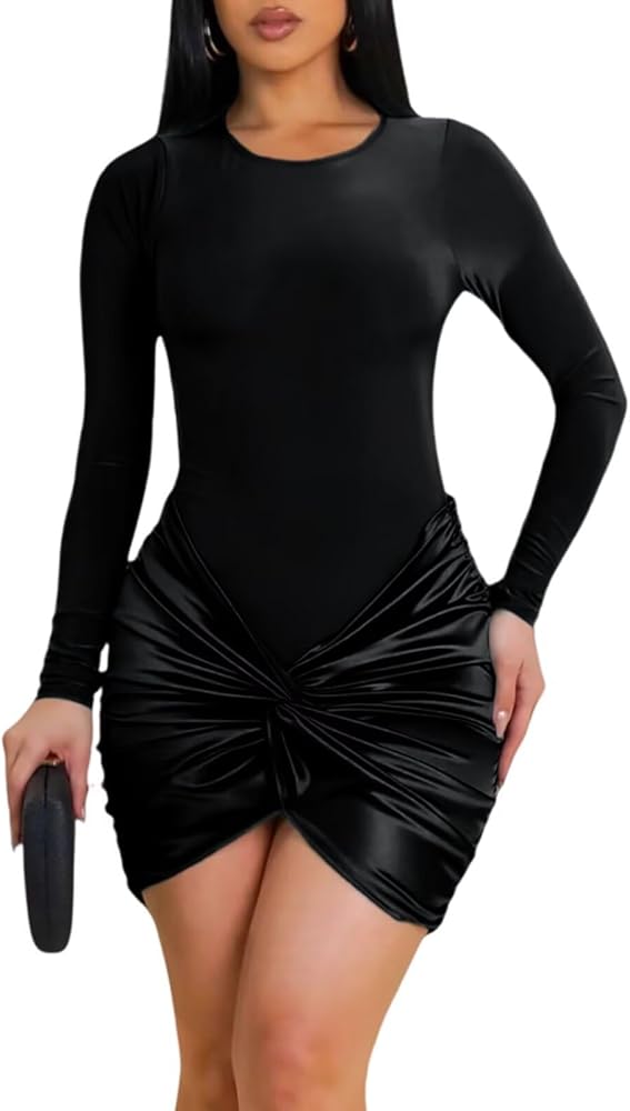 【DESIGN】The mini dress features long sleeve, crew neck, twisted knot design, above knee length, slim fit, ruched bodycon dress, fitted mini dress, bodysuit dress, wedding guest dresses for women, party dresses for women, elegant dresses for women.