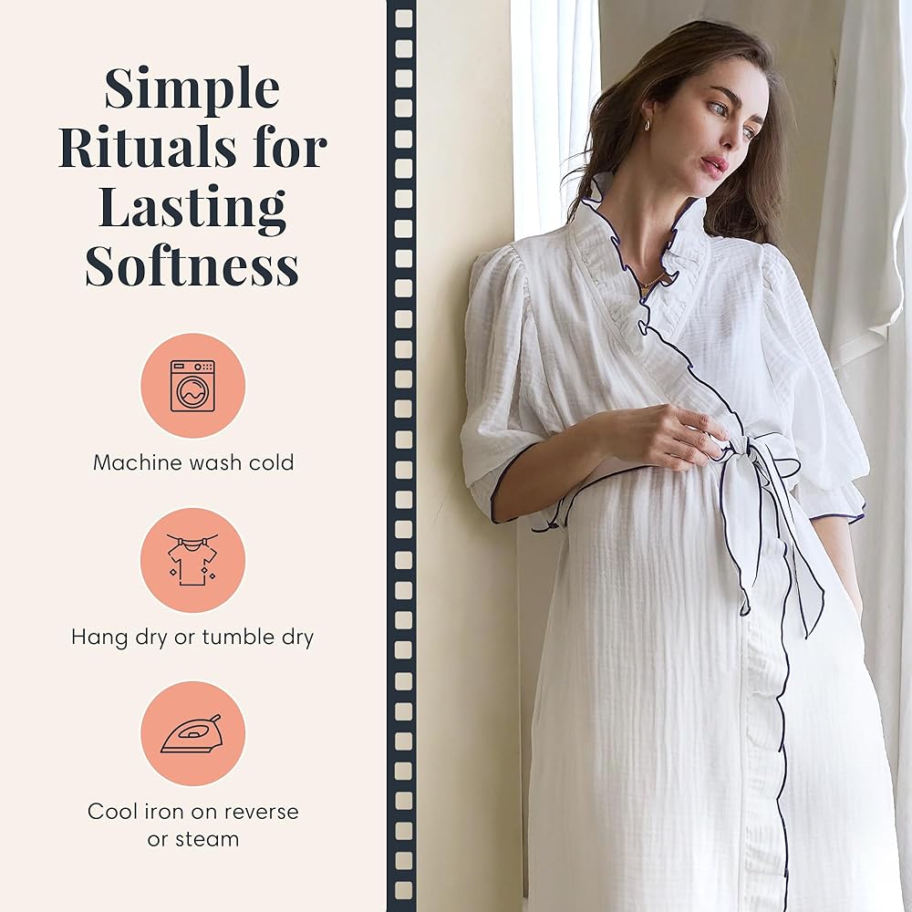 Soft Modal Cotton Comfort: Crafted from a breathable blend of 50% cotton and 50% modal, our maternity robe cotton piece is designed in triple-face gauze for softness and absorbency. Lightweight and cozy, it's perfect as a muslin gauze robe womens style to wear during quiet moments at home or while welcoming visitors.