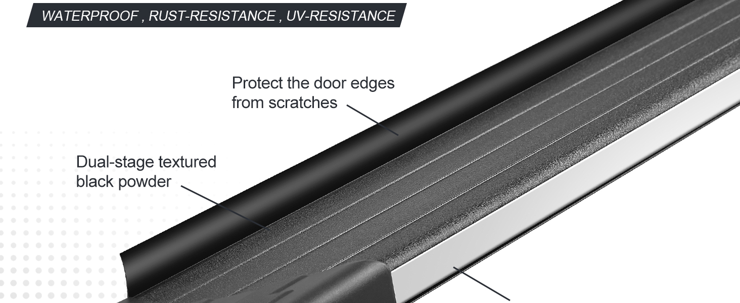 MATERIAL: The Running Boards Are Made Of Aluminum, Which Is Lighter Overall And Better Load-bearing. The Combination Of Aluminum And Dual-stage Textured Black Powder On The Surface Of The Running Boards Makes The Steps More Resistant To Corrosion And Effectively Resists Corrosive Objects From Outside.