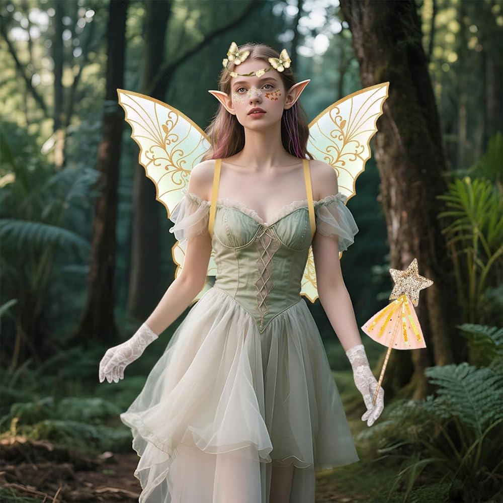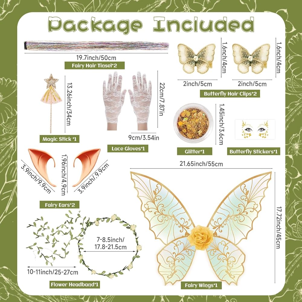 Complete Fairy Wings Set: Each set includes fairy wings x1, hair tinsel x2, floral garland x1, fairy star wand x1, and elf ears x2, butterfly hair clip x2, glitter x1, lace gloves x2, butterfly stickers x1,making it the perfect fairy costume for enchanting adventures.
