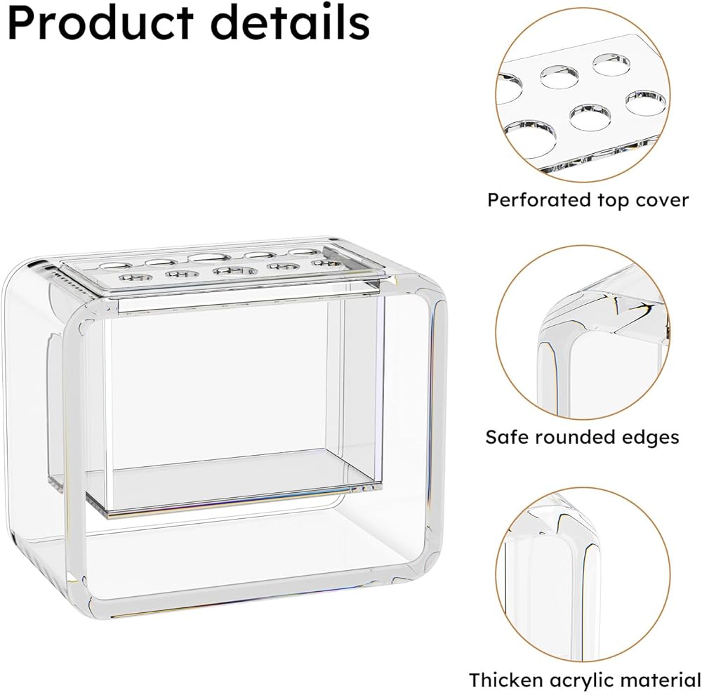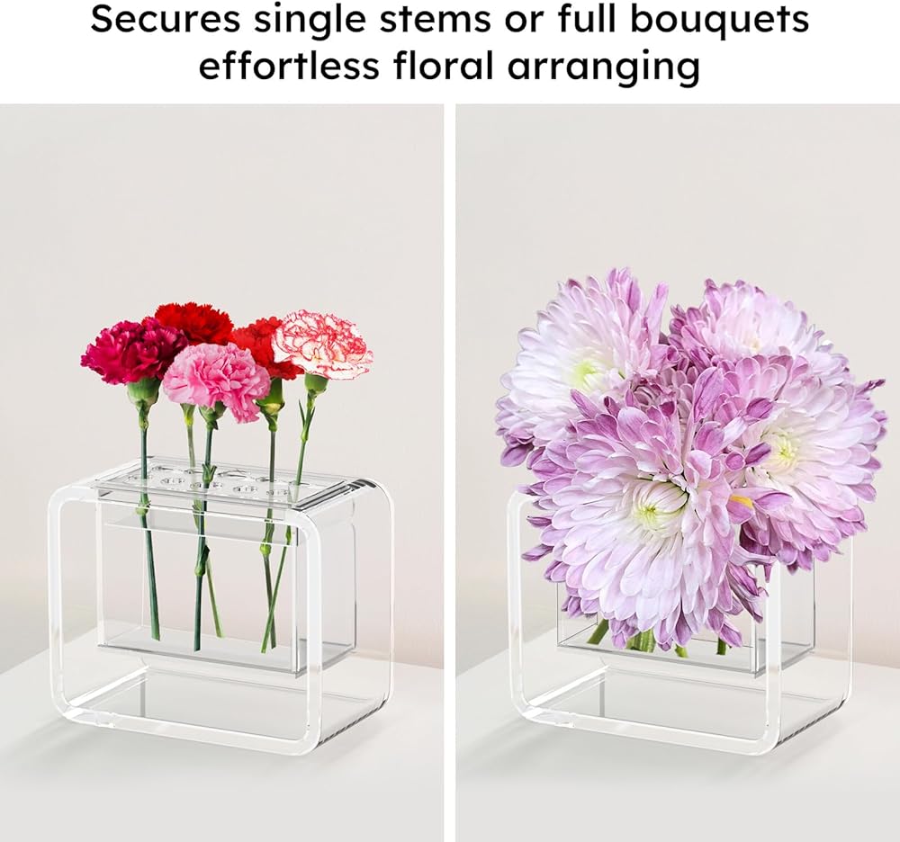 Unique Design - The clear flower vase features a detachable top lid with 10 precisely arranged holes, allowing single stems or small bouquet arrangements to stay securely in place without tape. When the lid is removed, the wide opening effortlessly accommodates large bouquets, beautifully showcasing the lush, layered charm of blooming flowers.