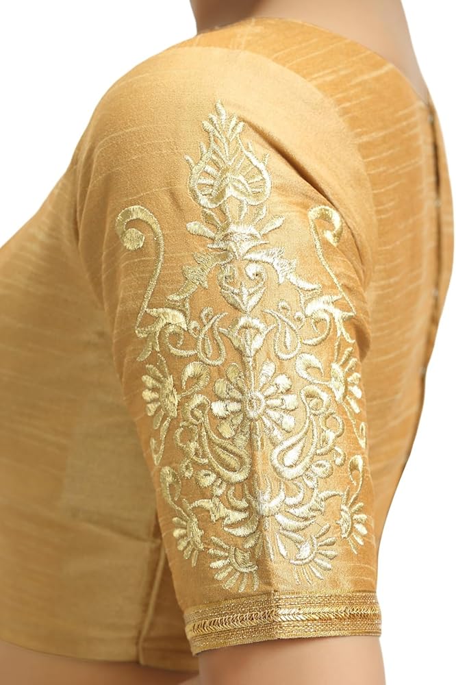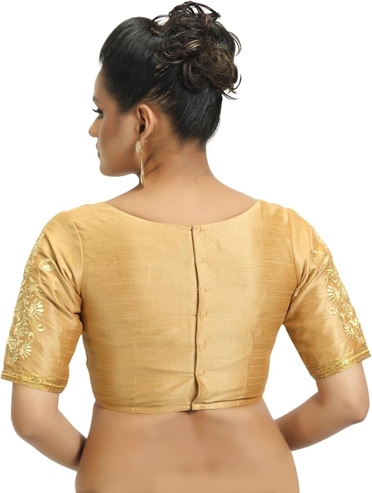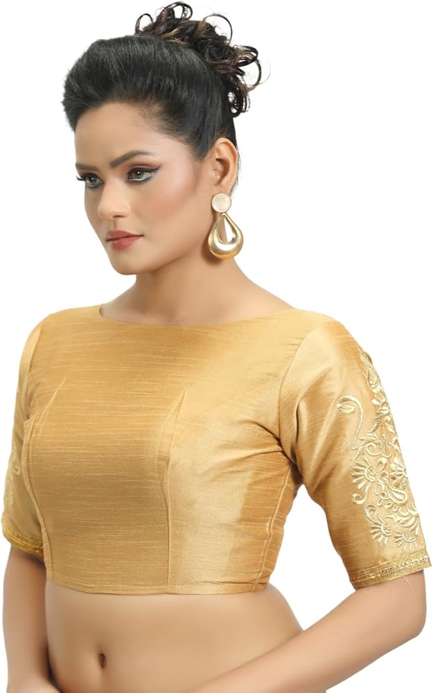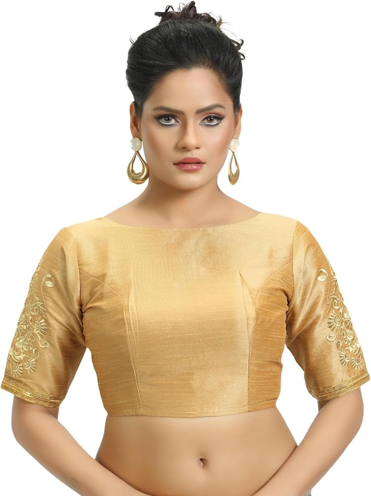 This is Madhu Fashion's latest Women's Poly Raw Silk Ready to Wear Blouse. This Blouse has a Boat Neck Design and Elbow Length Sleeves . This Blouse is lined with pure cotton for Extra Comfort. It has a back opening and it has hook as a closure type. It is available in 6 sizes and the following colours : BLACK; GOLD; MAROON; NAVY BLUE; PINK; RED.