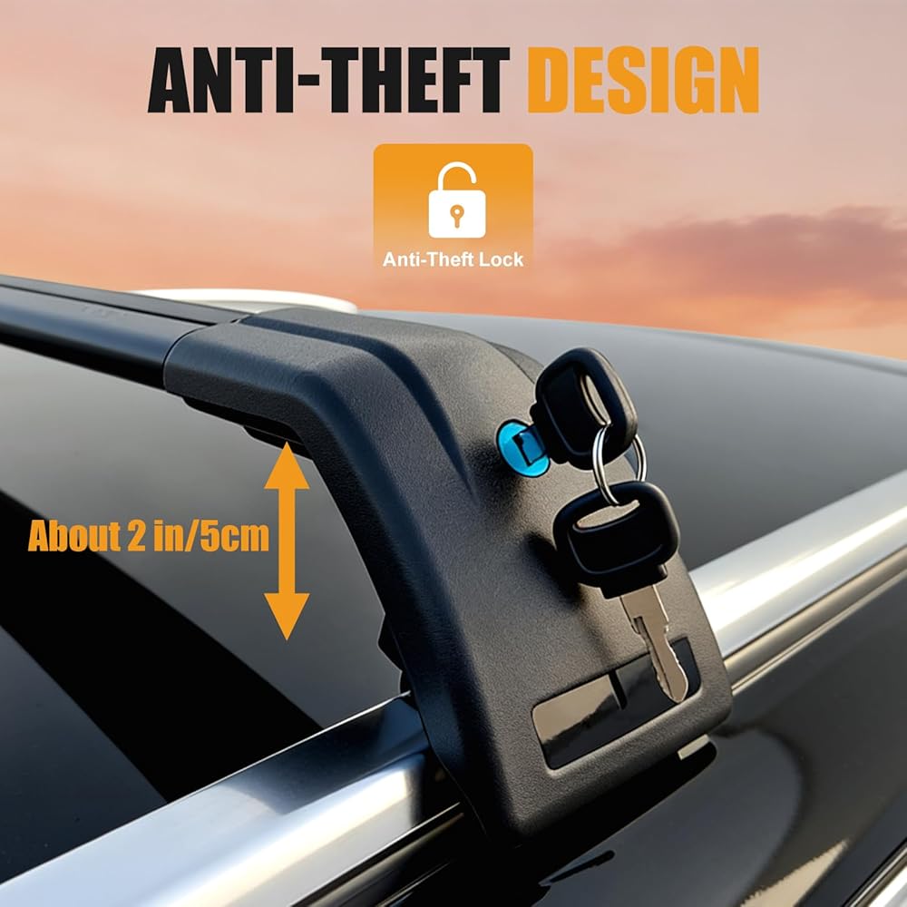 【MULTIPLE FUNCTIONE】High strength Roof rack cross bar with anti-theft lock system.Low profile & streamline design makes it effective in reducing the wind noise when driving on a high speed, cross rails for roof rack Can work with any roof accessories like cargo basket carrier, snowboard/bike rack,luggage box,kayak mount etc