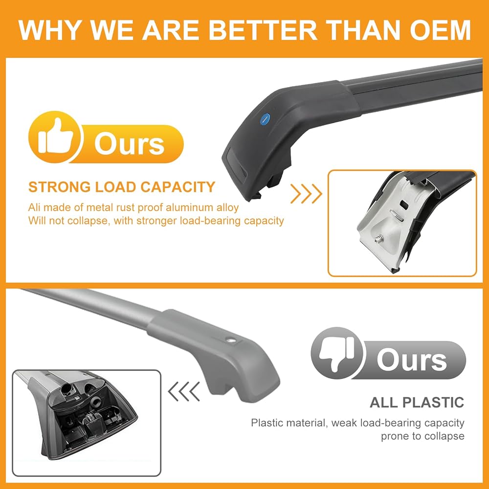 【HIGH QUALITY MATERIALS】High-grade aluminum alloy crossbars can support luggage, ladder or cargo,roof rails can support a weight of 300 lbs Base feet are made from high grade aluminum which add to extra security and durability.Cross roof rack bars, Durable, Lightweight, Multifunctional, Removable, Easy Installation, Rust-Resistant, Waterproof, Wind-Resistant