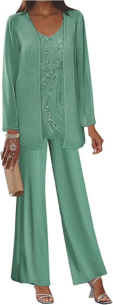 Designs: 3 Piece Mother of The Bride Pant Suits Chiffon Sequin Formal Wedding Guest Outfit for Women with Jacket