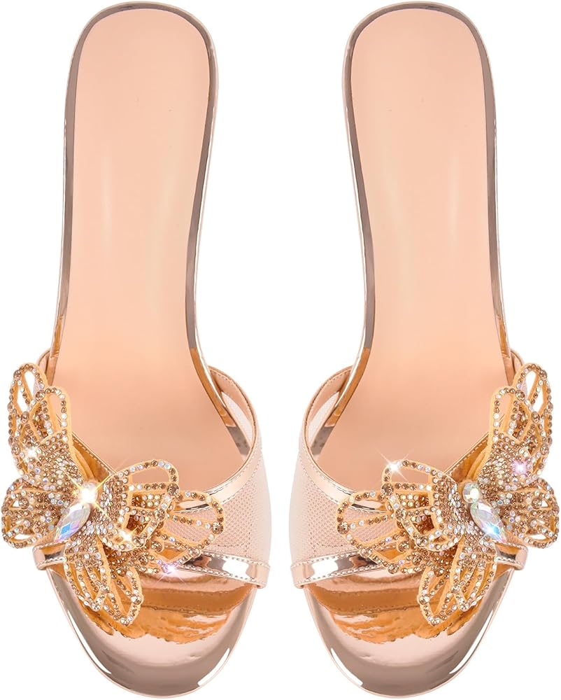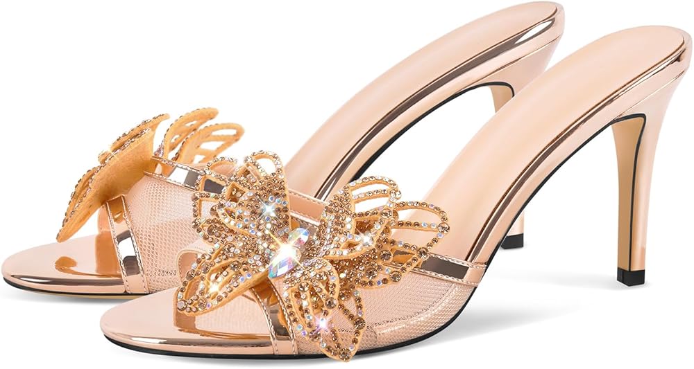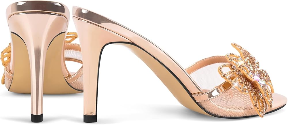 - Round open toe, slip-on, rhinestones studded, mesh, butterfly decoration, thin high heels, slipper, mules, slides sandals