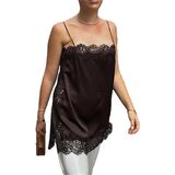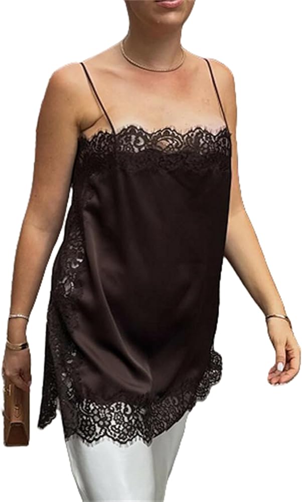 Design: Y2k girls satin silk lace patchwork tops, y2k going out tops, women silky lace trim cami tops, women irregular hem lace cami shirts, women trendy midi cami tops, women silk lounge shirt dress, lace ruffle hem, lace patchwork, chic casual style, cute and sunning to wear