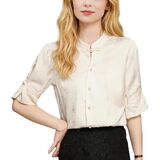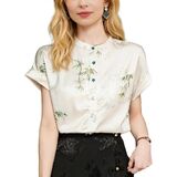 Feature: Vintage Silk satin fabric, Elegant Embroidery design, hight Neck, Jacquard fabric decoration , Casual Blouse, Flower Print, Regular Fit,short Sleeves,button down. It is a chic fashion summer Chinese style shirt top.