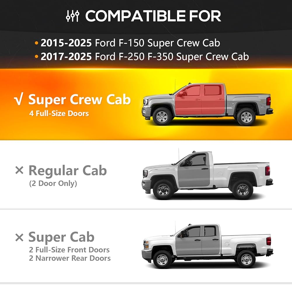【Compatibility】: OBNAUX Two Stairs Design Drop Running Boards are compatible with 2015-2025 Ford F150 & 2017-2025 Ford F250 F350 SuperCrew Cab Model (4 Full-Size Doors). If you are not sure about your model, please check the cab dimensions picture.