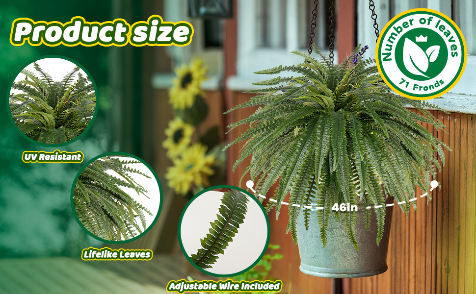 🌴【Perfect 46Inch Size with 71 Leaves】Each artificial fern stands 19" tall with 71 lifelike leaves. Features 23inch long fronds that create a lush 46inch diameter display for immediate impact.