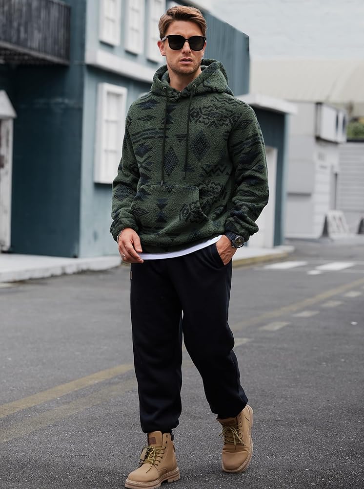 TRIBAL AZTEC HOODIE: Men's long sleeve graphic sweatshirt is always a fall and winter favorite. It features a perfect combination of retro vintage style and modern thermal comfort. It's a warm and cozy sherpa fluff shirt with trendy appeal. Make a statement with the distinctive tribal Aztec allover print of this plush hoodie and complete your fashionable ensemble.