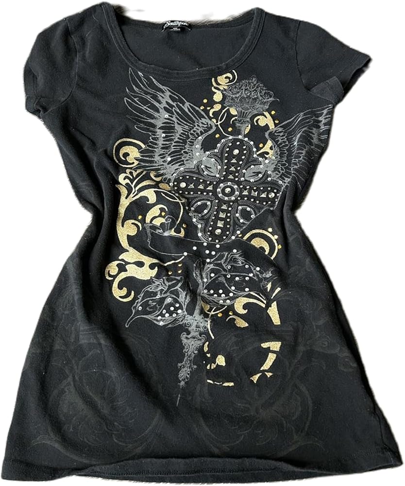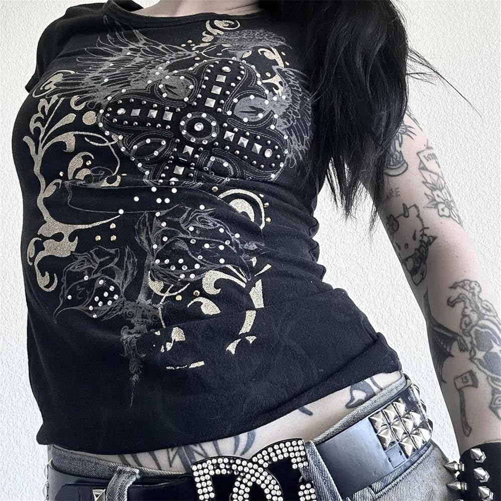 Feature: Women's tee shirts: Short sleeves, round neck, star & skull print, loose fit, basic length. Grunge shirts, pull-on closure, easy to put on and take off.