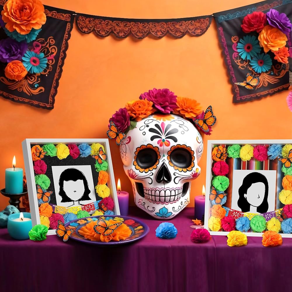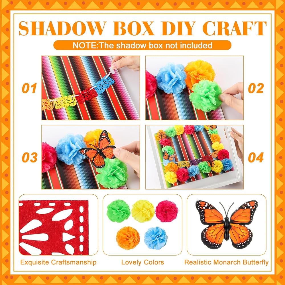In addition, you can also find more Day of the Dead DIY accessories, such as 30 Marigold flowers and 6 3D Monarch Butterflies that can be also applied to decorate your home. Our product also includes 2 mini Papel Picado Banner to add brilliance to your Shadow Box. This Day of the Dead shadow box diy accessories set is not only realistic and vivid, but also easy to use and versatile.