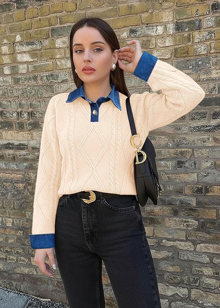Timeless design:Oversized sweaters for women, designed to elevate your style. Tunic sweaters for women features a stylish button-down polo collar for a timeless, contrasted with modern denim-style cuffs. Women's cable knit sweater is made of a cute & cozy fabrication, a standout staple in your wardrobe.