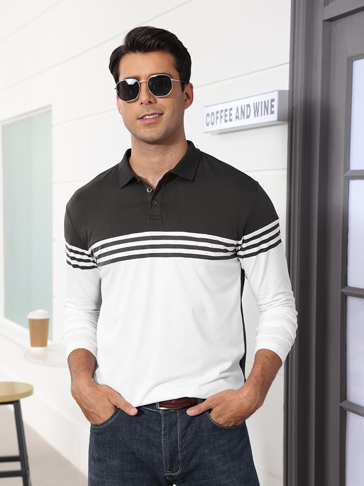 【Features】The polo shirt have contrasting horizontal stripes and make you look unique. Collared, three buttons, classic fit, long sleeve, high stretch, no pilling and no wrinkling.