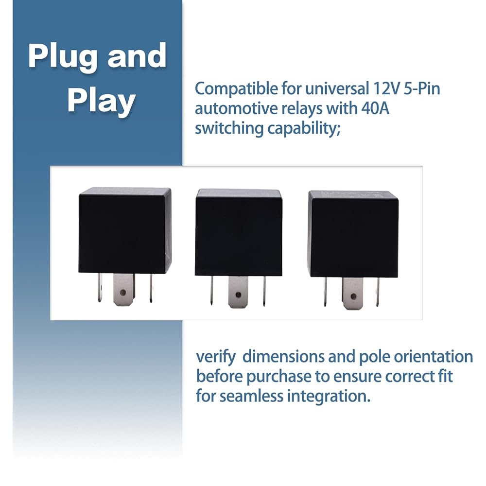 Plug and Play: Compatible for universal 12V 5-Pin automotive relays with 40A switching capability; verify dimensions and pole orientation before purchase to ensure correct fit for seamless integration.