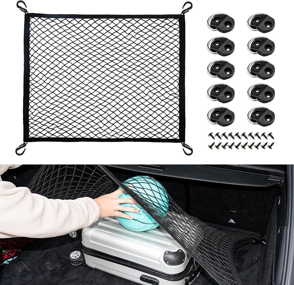 Fits Multiple Vehicle Models: The trunk storage net has an original size of 31.5x23.6 inches and can stretch up to 70.8x47.2 inches, making it compatible with various vehicles, including sedans, SUVs, RVs, Jeeps, MPVs, vans, and off-road vehicles, such as the Audi A4L, BMW X1, and Volkswagen SUVs. Whether for daily shopping or long trips, it helps you maximize limited trunk space efficiently