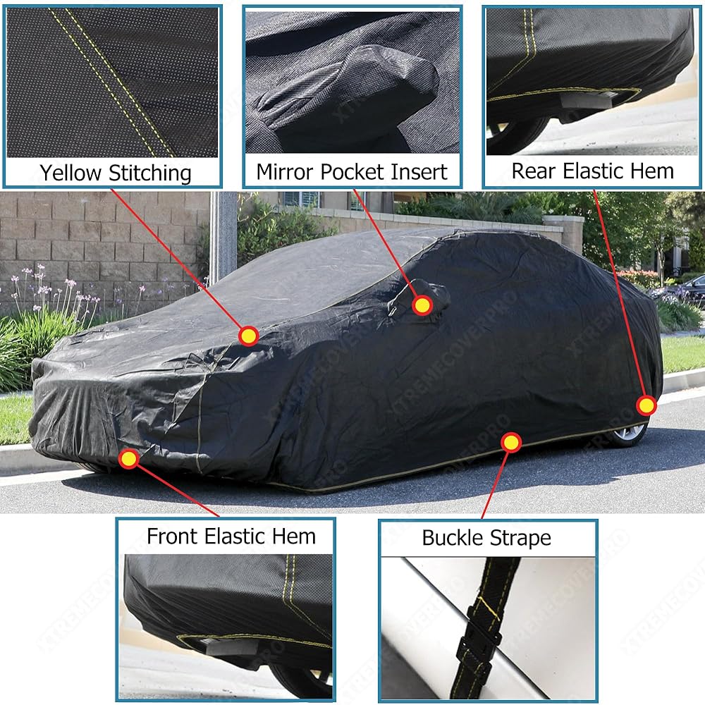 Black Fabric with Double Yellow Stitching: Beautiful black with yellow stitching car cover makes your car like in a show room vehicle.