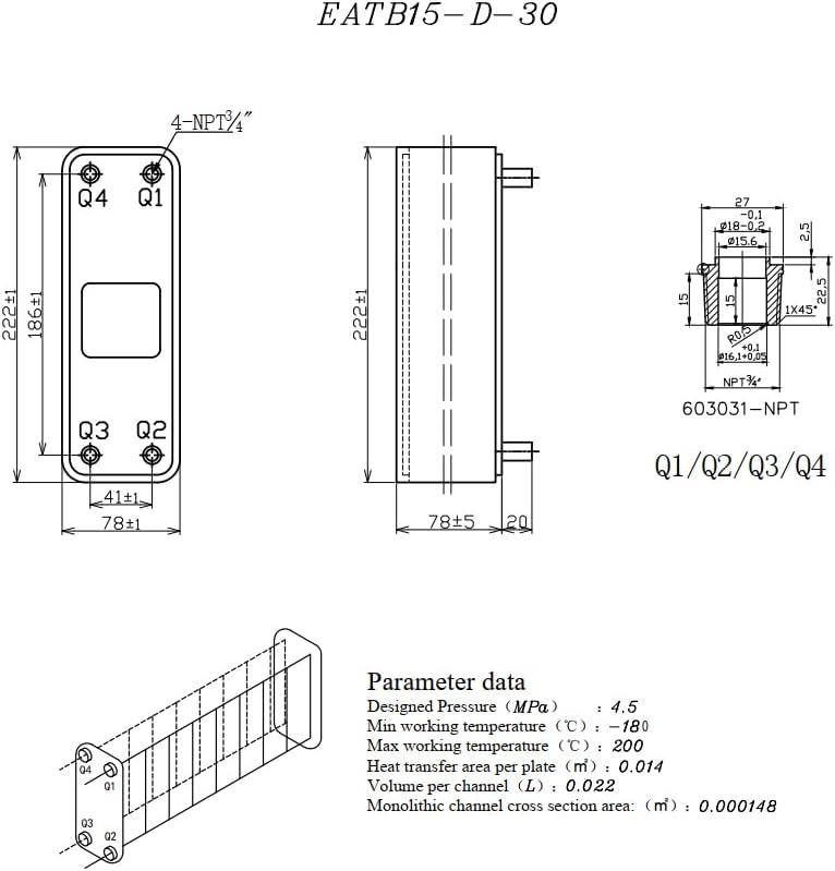 【Product Parameter】- Model: EATB15-D-20; Material: 316L stainless steel sheets + 99.9% copper; Plate: 3" x 8"-20 plates; Port: 3/4" MNPT; Designed Pressure: 4.5Mpa; Min Working Temp: -180℃; Max Working Temp: 200℃; Heat transfer area per plate: 0.014㎡; Volume per channel: 0.022L; Monolithic channel cross section area: 0.000148㎡