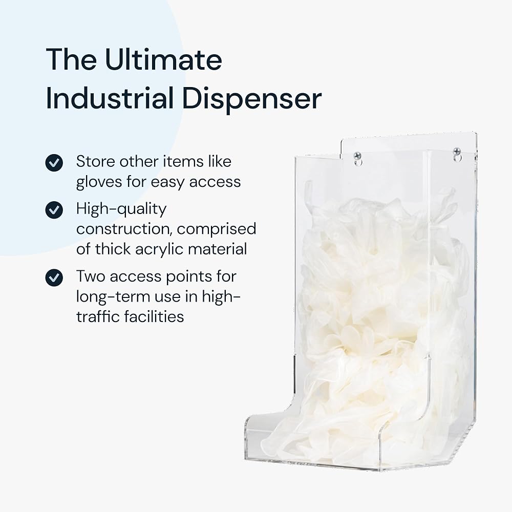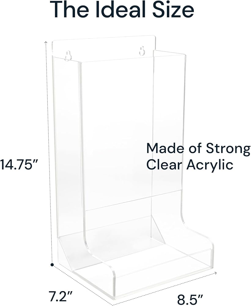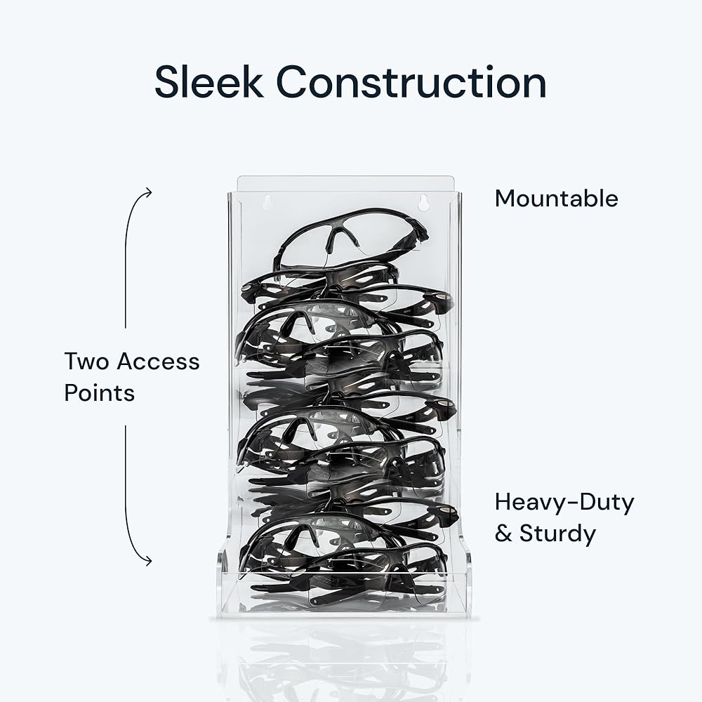 WELL CONSTRUCTED: Made to fit industrial standard safety glasses, comprised of thick acrylic material with two access points for retrieval of contents. Easy to refill and clear acrylic design aids in replenishment of product. Measures 8.5" L X 7.2" W x 14.75" H. The ideal size for all environments.