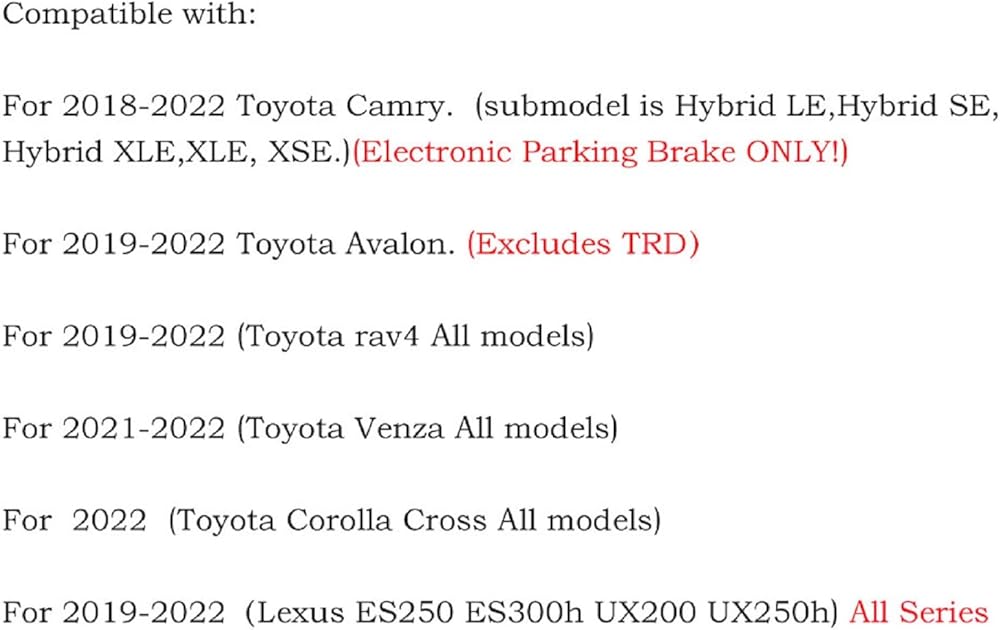 Replacement For 2018-2022 camry. (submodel is Hybrid LE,Hybrid SE,Hybrid XLE,XLE, XSE.)(Electronic Parking Brake ONLY!)