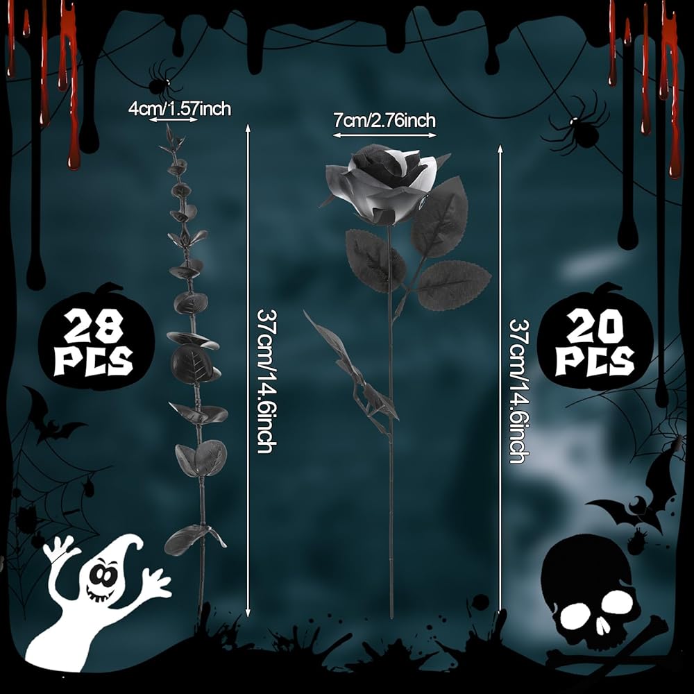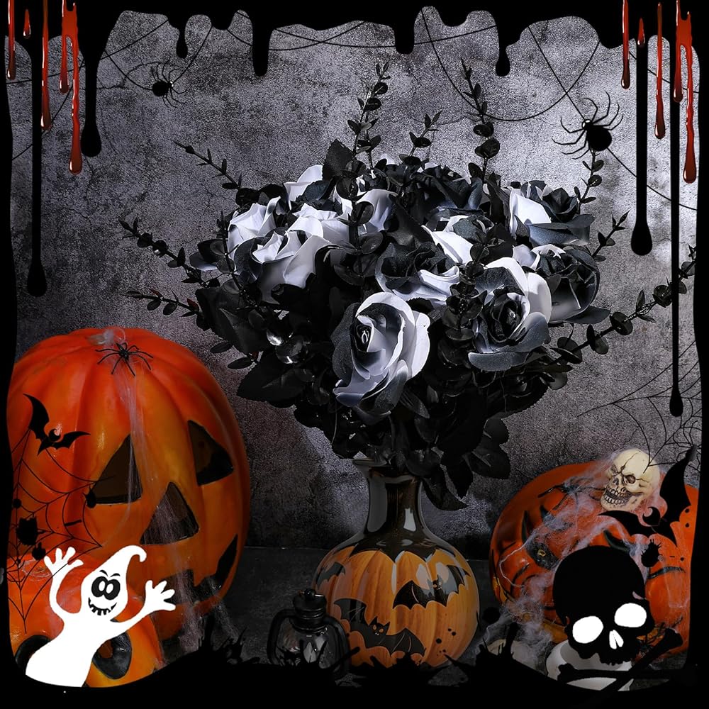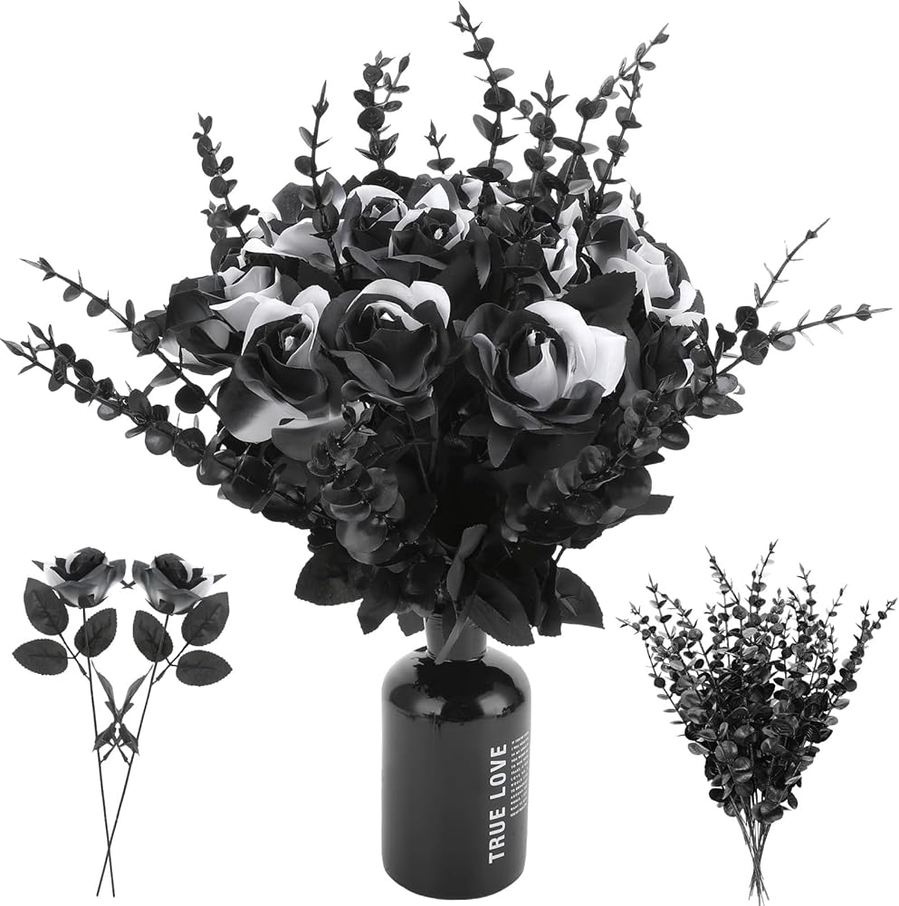 20 Pcs Black White Artificial Roses and 28 Black Eucalyptus Stems for Halloween, Silk Fake Flowers with Bendable Stems, DIY Gothic Wedding Bouquet, Haunted House Decor