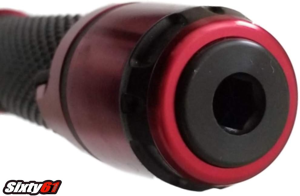 Black and red anodized in aircraft grade strength billet aluminum. No set screws to rattle off or any other parts