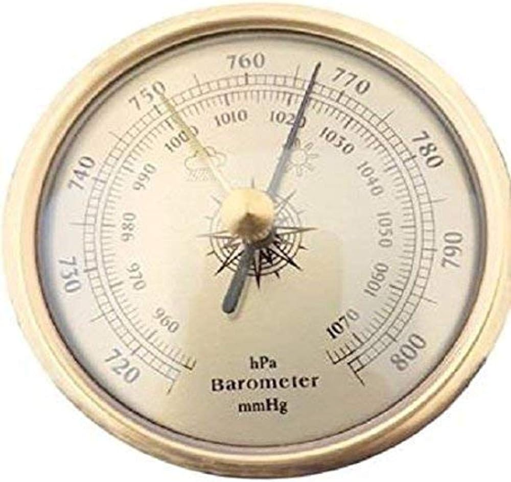 Ajax Scientific aneroid barometer dial. Measures in both metric and millibars of mercury. Gold metallic case, gold dial, black numerals and pointer. Supplied with soft plastic mounting ring for snug friction fit into a 55-millimeters size hole. 72-millimeters diameter.