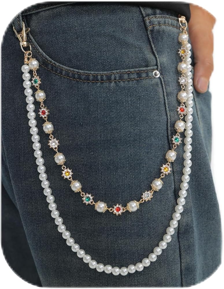 Wallet Belt Pants Chains for Men Women Pearl Rhinestone Flower Punk Jeans Pocket Key Chain Accessories Fashion Jewelry Gift