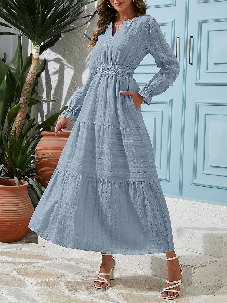 Highlight Design: this women's fall maxi dress features an A-line bohemian style design, long sleeves, v neck, high waist, and maxi dress design, elegant and casual; The tiered ruffle design adds a touch of charm, outlining the slender and elegant figure of women