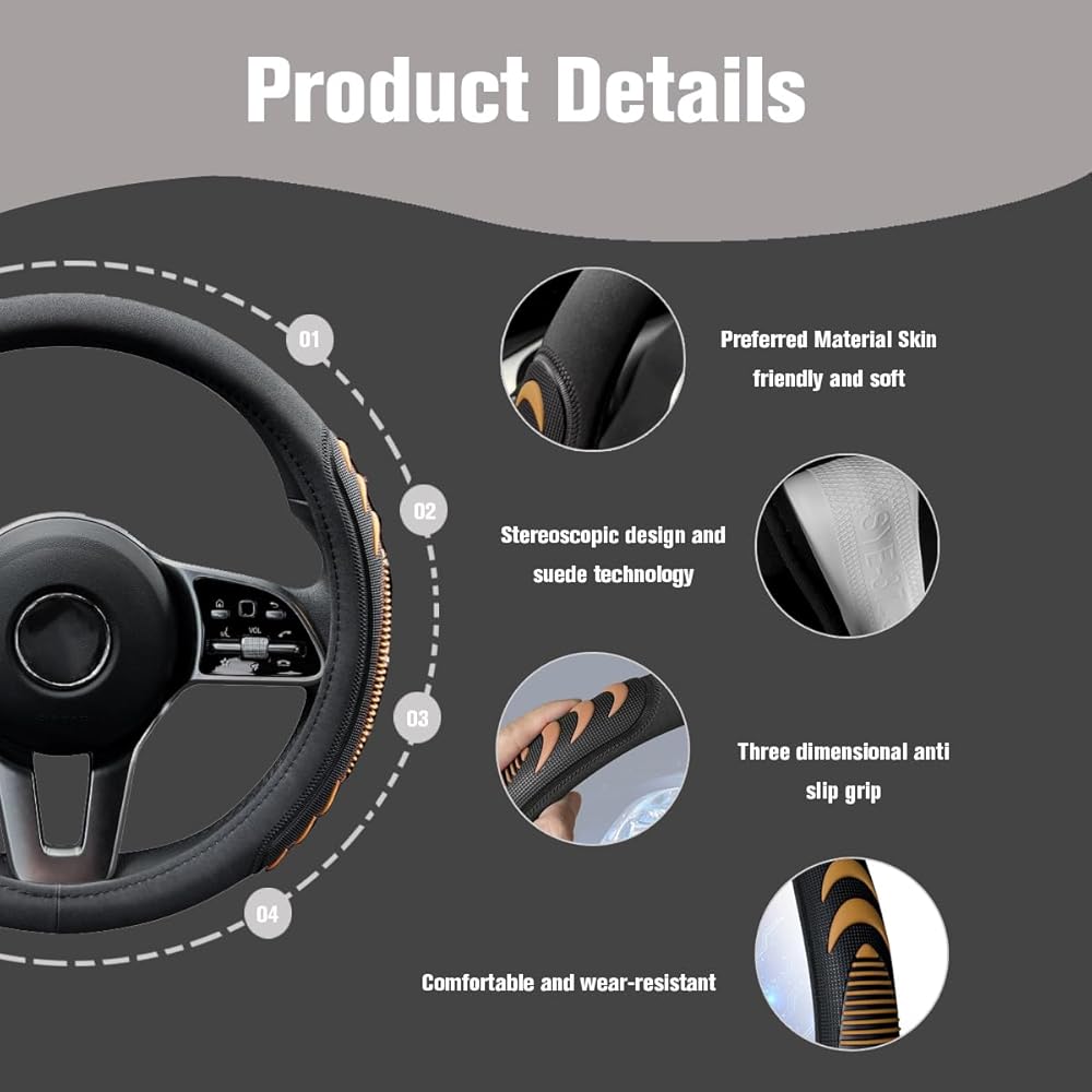 Soft & Durable Material: The car steering wheel cover is made of suede material, with skin-friendly and breathable features, providing a soft and comfortable touch when in contact with hands. In addition, suede material has strong wear resistance and can withstand long-term use. The rubber lining has great anti-slip effect, excellent toughness and is not easily deformed. In addition, the anti-slip patterns inside can tightly fit the steering wheel and prevent displacement.