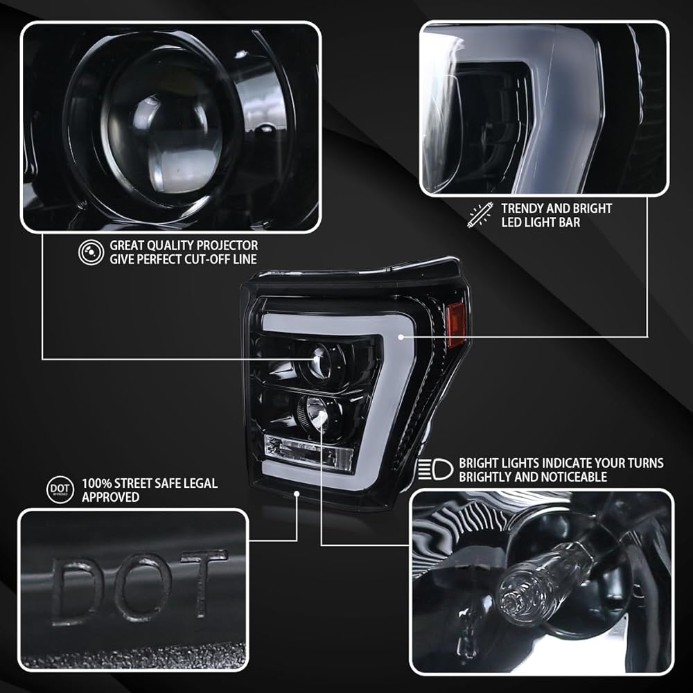Autozensation Compatible with 2011-2016 Ford F250 F350 F450 F550 Super Duty, Left + Right Pair Headlamps Assembly, Glossy Black LED Bar Projector Headlights