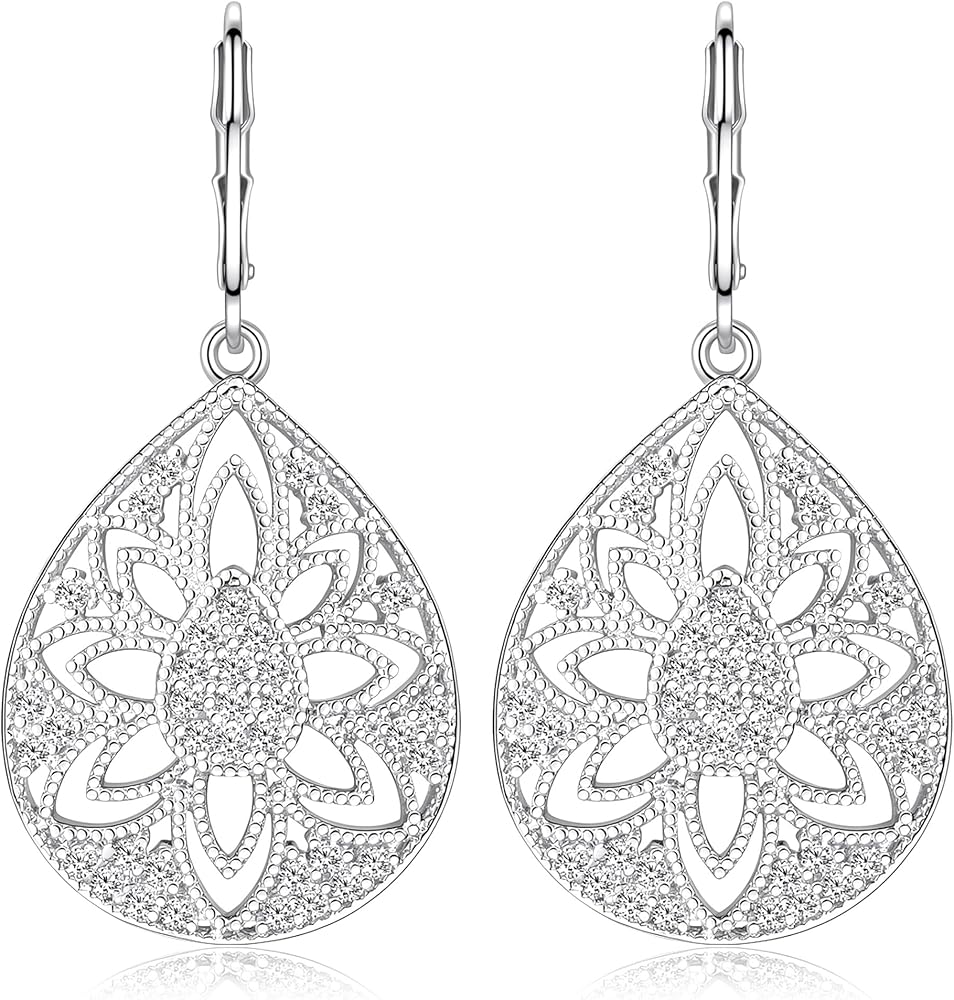 925 Sterling Silver Dangle Earrings for Women Leverback Filigree Teardrop Earrings Hypoallergenic Silver Dangle Drop Earring for Gifts